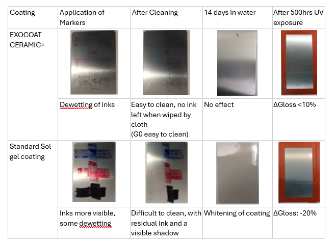 2. Adhesion and Hardness: Both coatings passed the adhesion test after using an alkaline degreaser, but EXOCOAT™ CERAMIC+ showed slightly better hardness (10N) compared to Standard Sol-gel coating (8N).